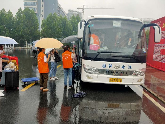 在学校各个门口、咨询服务点、各学院报到处、新生宿舍,随处可以看到我校迎新志愿者们忙碌的身影,他们为新生提供校园引导、报到咨询、行李运送、临时休息等新生服务。他们身上的志愿者服装、志愿者证件,如一面面高高飘扬的旗帜,指引着新生同学们。在各车站,志愿者们在出站口迎接着师弟师妹们;在校园路口,志愿者们撑着伞为新生指路,带领他们去迎新点办理报到手续;在迎新点,志愿者们帮助新生完成报到流程,帮助他们搬运行李,为他们提供便利。