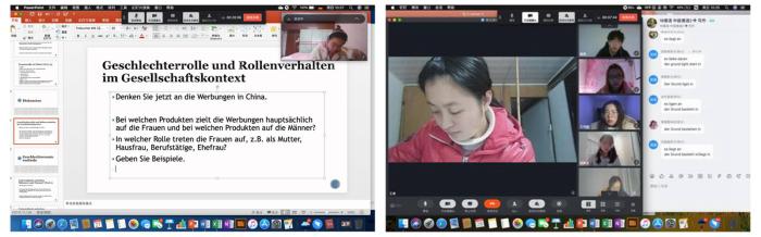 课堂上,我坚持不唱独角戏、要做团体操的原则,积极开展线上互动,学生参与感强,课堂氛围轻松融洽,并实时反馈和解答问题。《中级德语 2》平均每节课互动次数上百,我通过多层次输入,从语言层面的词句篇章的表达到内容结构与意义的讲解,再到社会文化的背景结合与主题补充,提供相关音频、视频资源,充分调动学生课堂参与的积极性和语言产出的热情,将问题和思考融入班级互动,依据课程难度,采取翻转课堂的形式,组织班级结成学习小组,充分发挥学生的创造力和团队合作能力。课后,利用腾讯会议,展开一周班会,收集学生线上学习效果反馈,及时备案与调整。
