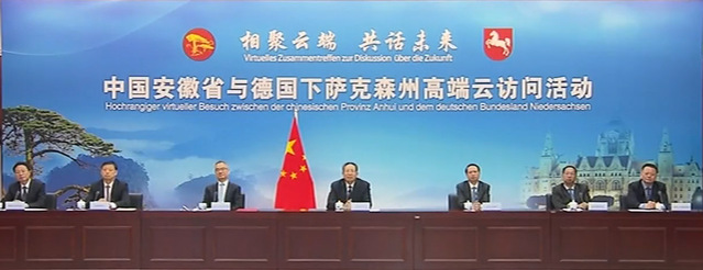 Am 16. Juli hielten die Provinz Anhui und das deutsche Bundesland Niedersachsen eine Videokonferenz zum Thema Virtuelles Zusammentreffen zur Diskussion über die Zukunft — Hochrangiger Virtueller Besuch zwischen der chinesischen Provinz Anhui und dem deutschen Bundesland Niedersachsen ab. An der Veranstaltung nahmen Li Jinbin, Sekretär des Komitees der Kommunistischen Partei der Provinz Anhui, Wang Qingxian, Gouverneur der Volksregierung der Provinz Anhui, Stephan Weil, Niedersächsischer Ministerpräsident, Zhang Xi, Vizegouverneur der Volksregierung der Provinz Anhui, Du Xiaohui, chinesischer Generalkonsul in Hamburg, Thomas Triller, amtierender deutscher Generalkonsul in Shanghai, und Wu Chunmei, Präsidentin der Universität Hefei teil.