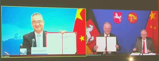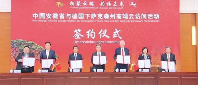 Wang Qingxian und Weil unterzeichneten online die Absichtserklärung zwischen der Volksregierung der Provinz Anhui der Volksrepublik China und der niedersächsischen Landesregierung der Bundesrepublik Deutschland über die weitere Vertiefung der freundschaftlichen Beziehungen zwischen Anhui und Niedersachsen und tauschten Geschenke aus.