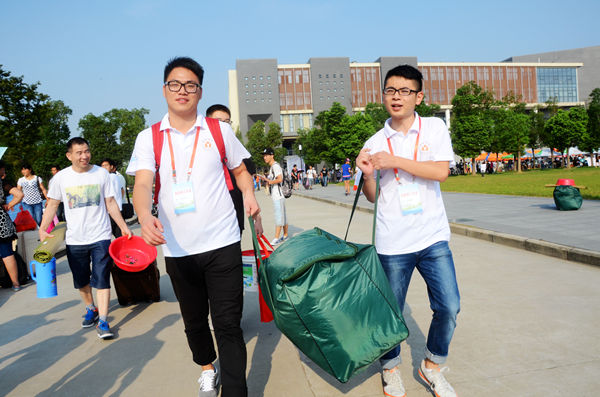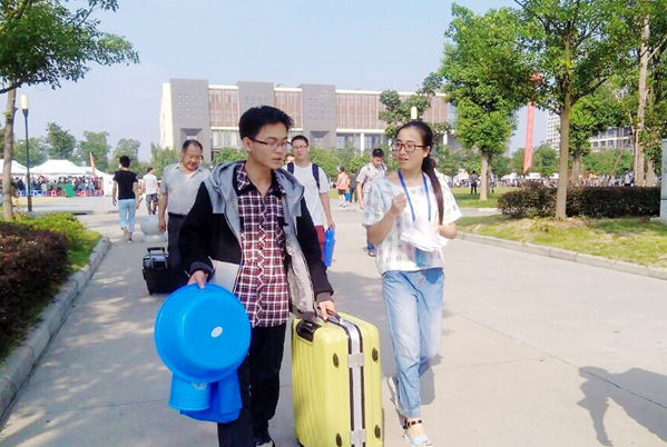 化学与材料工程系2015级新生行少冬,为了把握机会锻炼自己,只身一人,拖着行李箱、背着背包,坐上开往合肥的火车。历经15个小时,在9号清晨顺利到达合肥火车站。他告诉记者,一来到学校,就被美丽的风景所吸引,热心的志愿者亲自帮他排队领代购物品,并耐心介绍学校情况,一直帮他送到宿舍,完成报,让他倍感亲切。