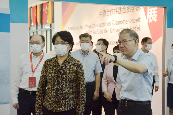 在参观中德合作共建合肥学院展的过程中,翁铁慧一行听取了王其东对我校建校历史、教育教学改革、国际交流合作、产教融合等情况的相关介绍,翁铁慧对学校建校以来坚持的“按社会需求设置专业”的做法给予认可,肯定了学校的办学定位及高层次应用型人才培养取得的成果。