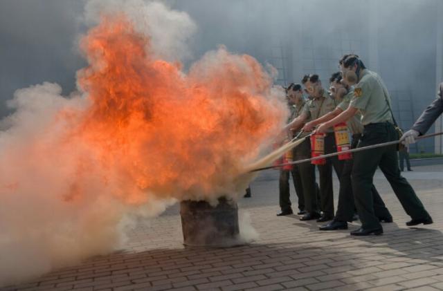 上午九点,伴随一声“哨响”防震避险消防逃生演练正式拉开序幕。参演学生迅速“紧急避险”,大家迅速抱头、重心下移蜷缩躲在角落里。当再次接到疏散指令后,学生们在安全引导员的指挥下迅速向安全区域有序撤离疏散。随后,“火警”响起,烟雾四起。体育馆内的学生以最快的速度到达所在的岗位进行人员疏导。消防疏散的警报后,学生们采取低头、毛巾捂鼻等方式快步穿越烟雾区,离开体育馆。整个活动撤离有序,行动迅速。活动最后,在场官兵为在场学生演示了灭火器的使用方法,并讲解注意事项。武装部部长肖宝生对学生们的应急处理进行表扬,并宣布本次防震避险消防逃生演练至此顺利结束。