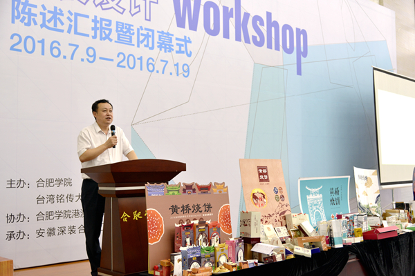 7月18日,合肥学院第二届海峡两岸大学生包装设计WORKSHOP作品陈述汇报暨闭幕式在图书馆报告厅顺利开展。本届WORKSHOP于7月9日正式启动,由安徽泗县农产品包装设计、安徽四大名茶包装设计、江苏泰兴市的黄桥烧饼和黄桥脱脂肉特色产品包装设计四个类别组成,海峡两岸56名师生参与设计。合肥市市政协副主席、市民革主委李晓梅、市台办副主任胡卫平、市政协港澳台侨专委会主任李嘉华、市民革秘书长涂敏、台湾铭传大学教授方菁容、林建华、安徽迅达文化投资集团董事长葛茂金、校党委书记蔡敬民、校长张文兵、副校长刘建中,以及我校相关部门负责人应邀参与此次活动。活动由合肥学院艺术设计系主任谢海涛主持。
