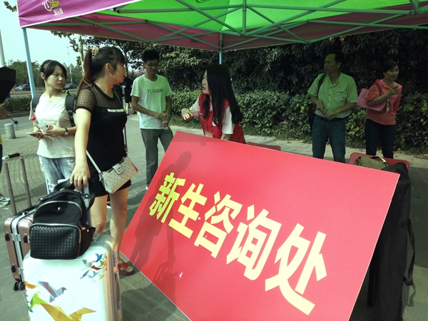 在学校各门口、咨询服务点、各系报到处、新生宿舍,随处可以看到志愿者们忙碌的身影,为新生及家长提供校园引导、报到咨询、行李运送、临时休息等新生服务。他们身着统一的服装,配带志愿者证穿梭奔波在校园里,像一面面飘扬的旗帜,为新生指引着方向。有的在路口为新生指路,带领他们去迎新点办理报到手续;有的在迎新点志愿服务,帮助新生完成报到流程;有的在迎新点旁边等待,帮助新生搬运行李,给家长送来茶水;有的则在宿舍楼内为新生发放和搬运卧具,为新生提供便利。