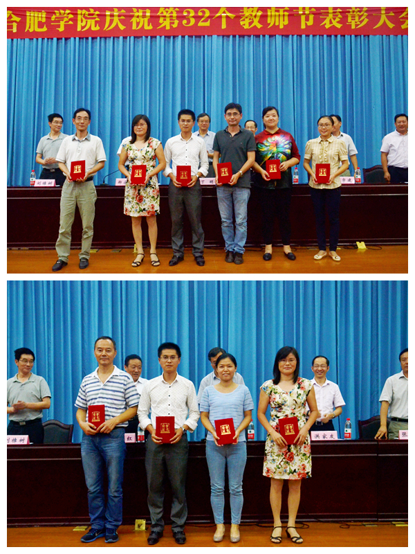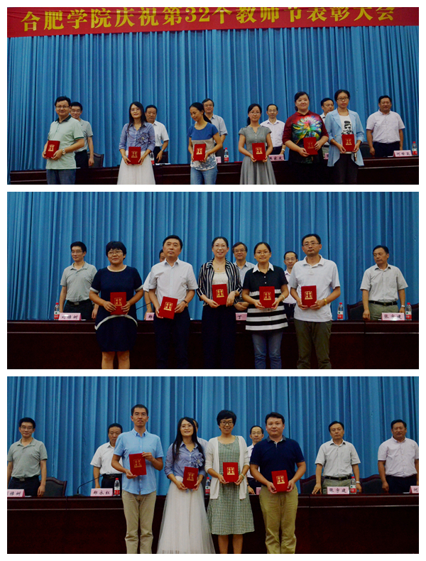 为表彰在教育教学中作出突出贡献的教师和弘扬尊师重教的良好风尚,郑永红宣读表彰文件,对教师先进集体和先进个人进行了表彰。受表彰的集体和个人有:研究生课堂教学优秀教师、硕士研究生优秀导师、教学管理先进个人、教学管理先进集体、“三育人”先进个人、师德建设先进个人、安徽省教学名师、教坛新秀、省“教学成果”奖代表、省“高校数学微课程教学竞赛”获奖代表等。丁明等为获奖集体和优秀教师代表颁奖。教师代表姜从山、学生代表崔莹瑄在大会上相继发言。