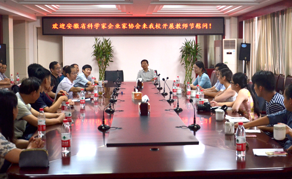 9月9日,安徽省科学家企业家协会来校开展教师节慰问活动。合肥学院纪委书记、安徽省科学家企业家协会副会长洪家友在行政楼会议室热情接待来宾,各系教师代表陪同与会。
