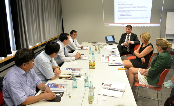8月29日上午,代表团到访位于德国威廉港的雅德大学,与该校校长瓦尔森斯教授、外办主任梅恩女士等就两校2+3专业共建、学生交流等后续合作事宜进行了讨论,并会见了我校于当地学习的近20位留学生代表,详细了解了他们的学习和生活情况,并鼓励他们发扬我校留德前辈的刻苦精神,争取在学业和工作上取得更大突破。代表团一行还于威廉港拜访了我校德籍合作老专家迈勒斯教授,蔡敬民书记向其介绍了学校对德合作,特别是基地建设的进展情况。29日下午,代表团继续访问罗斯托克大学,并与我校德籍客座教授、中国政府友谊奖获得者莱勒斯教授,以及该校国际办公室主任帕尔鲁斯先生,就两校开展德语教师交流培训、德语教学合作、环保与生物质能源领域协同创新平台建设等事宜进行了意见交流。30日上午,蔡敬民一行来到施特拉尔松德,在筹备我校孔子学院揭牌活动前期,与施特拉尔松德应用科学大学校长、中国政府友谊奖获得者、我校客座教授霍恩,以及该校副校长皮特森教授,就两校未来合作的重点领域及孔子学院事宜进行了交流。31日上午,蔡敬民书记率代表团拜访安哈尔特应用科学大学,该校新任校长巴格丹教授、我校德籍客座教授凯尔斯腾等人给予了接待。蔡敬民首先对巴格丹教授新任校长一职表示了祝贺,并对凯尔斯腾教授生日当天接待我校代表团一行表示感谢和祝贺,并介绍了我校中德基地建设的发展情况。巴格丹校长表示期望于近期访问合肥学院并期待安哈尔特应用科学大学可以在中德基地建设领域发挥作用。9月6日上午,代表团一行受邀访问耶拿应用科学大学,该校外办主任福斯特女士及电子系教授迪特里希给予了接待,并引导参观了该校先进电子技术实验室及激光加工实验室。福斯特女士在了解了我校对德合作及基地建设情况后,详细介绍了该校针对中国交换学生的专业及服务工作,并期待明年访问合肥学院时就两校合作签署协议。6日下午,代表团前往希尔德斯海姆访问我校传统合作高校——希尔德斯海姆/霍尔茨明登/哥廷根应用科学大学,该校校长丁奈尔教授及外办主任考兹女士对我校一行的访问表示欢迎,并介绍了该校后期国际化发展战略,期望结合我校基地建设,进一步深化双方已有的31年友好合作关系。8日下午,代表团受邀访问美因茨应用科学大学,该校经济系主任迈勒-毕歇尔教授、国际项目负责人亨塞尔教授及史兰克教授,对期待已久的我校到访表示欢迎,双方就两校合作签订了框架协议。校方向代表团一行着重介绍了该校极具特色的经济类双元制高等教育培养模式,并就下一步合作的重点方式等内容进行了交流和确定。