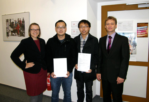 通过合肥学院与安哈尔特应用科学大学的合作,刘景炜和胡育铭同学来到安哈尔特就读已有一年时间。期间,两名同学学业努力,认真完成教授布置的项目任务、主动参加学校举办的各项活动,是表现杰出的外国留学生。得知获此殊荣后,他们非常高兴获得肯定,并对该专业协调人Heiko Rudolf教授平日的帮助与申请奖学金过程中的支持表示感谢。Rudolf教授与安哈尔特应用科学大学外事办主任Beer女士给两名获奖同学颁发证书,祝愿他们未来获得更大的成功,也希望加强两校合作,将来能有更多优秀的合肥学院学生来到安哈尔特攻读完成学业,成为出色的工程师。
