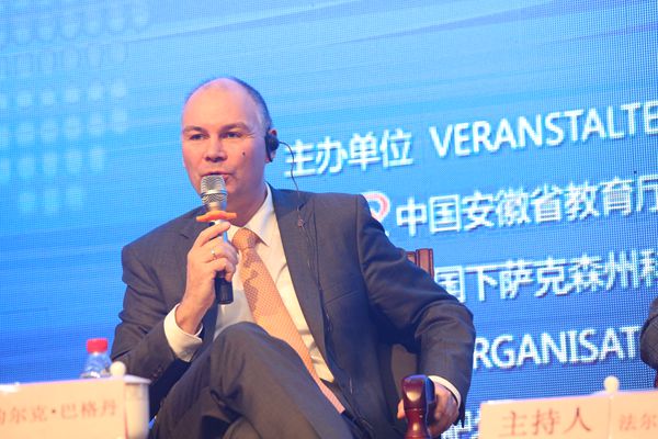 10月28日,在第九届中德应用型高等教育研讨会上,合肥学院党委书记蔡敬民教授与合肥学院合肥德国应用科学学院德方院长法尔克·霍恩教授主持进行了校长对话,德国奥斯纳布吕克应用科学大学校长贝尔特拉姆教授、德国德累斯顿学院校长亨塞尔教授、德国埃姆登/里尔应用科学大学克罗伊茨教授、德国安哈尔特应用科学大学校长巴格丹教授与中国长春工程学院校长韩立强教授、石家庄学院校长王俊华教授、长沙学院校长杨小云教授、许昌学院校长赵继红教授围绕第九届中德应用型高等教育研讨会基于中国制造“2025”与德国工业4.0背景下应用型大学的使命与变革展开共同探讨。