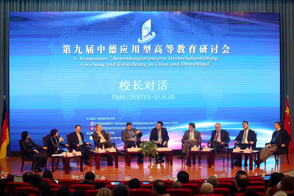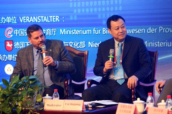 对话启动前,来自中德两国的8位校长依次介绍了各自学校情况。蔡敬民首先首先向在座的德国校长提出两个问题:如何看待欧洲文化一体化及德国应用型大学教育发展的前景?德国大学的专业设置是否具有国家标准?德国奥斯纳布吕克应用科学大学校长贝尔特拉姆坦言这是一个很有意义的问题,在欧洲的文化潮流中,思考如何将应用型教育与之融合也是他们正在研究的问题。安哈尔特应用科学大学校长巴格丹教授表示,国家对学校设置专业都有一定的标准,德国教育管理部门也组织了认证机构对大学专业的具体内容以及对学生的具体影响进行考察,学校再结合自身特色以及保持学生未来发展空间的情况下设置合理专业。