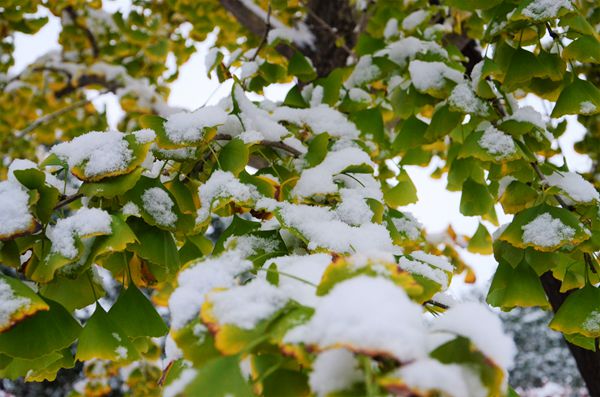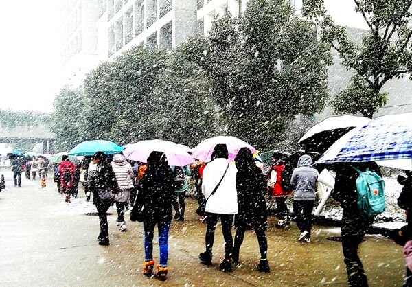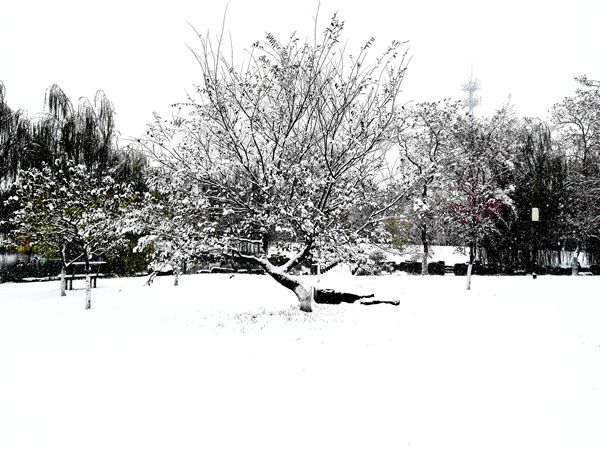 梅花未开,枝桠已经雪白,树木环绕,校园在喧嚣的城市中格外宁静,一片雪白中留下了同学们的足迹,处处洋溢着校园之美。