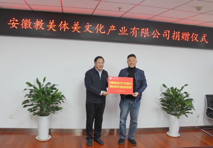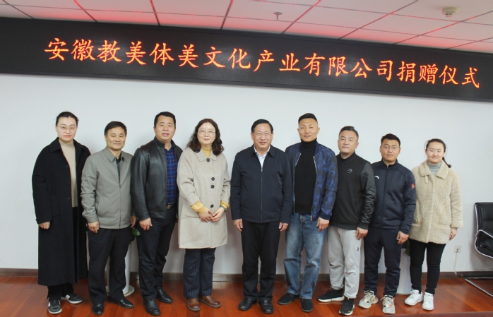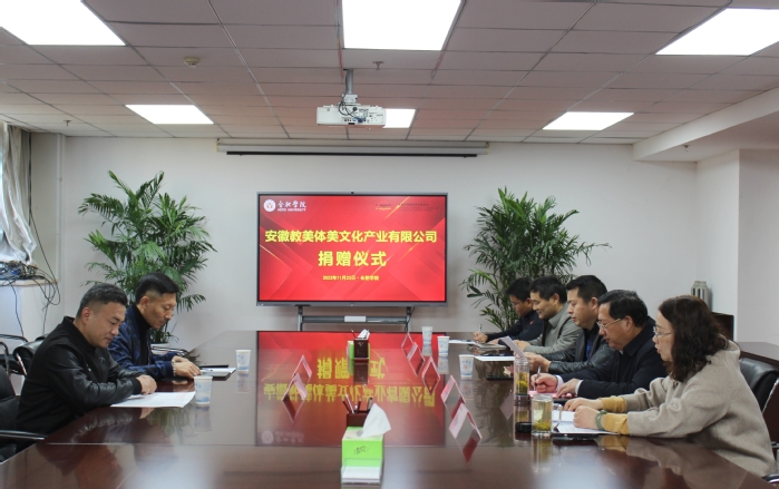 11月23日上午,安徽教美体美文化产业有限公司体育器材捐赠仪式在我校行政楼八楼会议室举行。公司总经理彭红伟、安徽中德教育合作基金会秘书长何世昆、公共体育与艺术教学部主任许刚等参加捐赠仪式。仪式由基金会管理办公室主任刘金平主持。