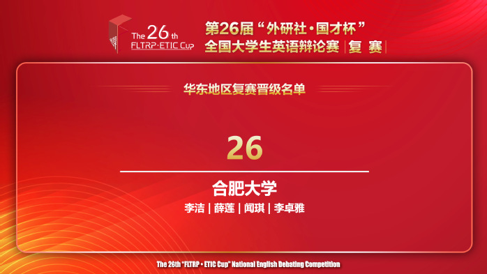 “外研社·国才杯”全国大学生英语辩论赛是2023年全国普通高校学科竞赛排行榜内竞赛项目,本次华东地区复赛中,来自山东、安徽、江苏、上海、浙江省的116支队伍参赛,安徽省内仅有2支参赛队伍晋级全国决赛。我校外国语学院致力于培养新时代复合型应用型外语人才,重视并大力支持外语学科竞赛等第二课堂活动。英语专业演讲辩论竞赛指导团队多年来坚持指导学生参加各级各类英语辩论比赛,取得了丰硕的成果。
